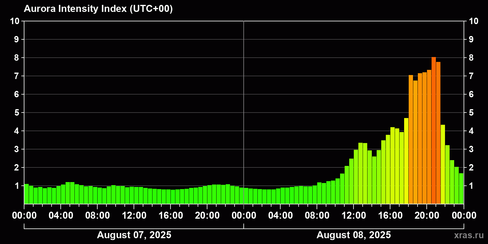 Auroral intensity index and the theoretically possible latitude of observations for nighttime in the Estern Hemisphere as of 2025-08-08 23:58 (end of day) local time