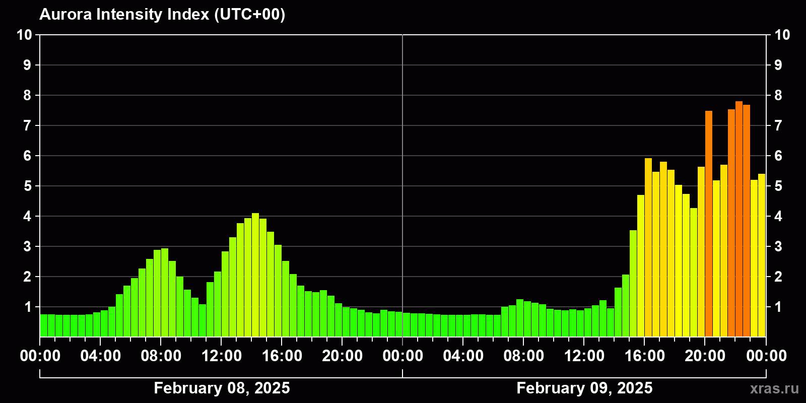 Changes in the auroral intensity index from 2025-02-08 to 2025-02-09 local time