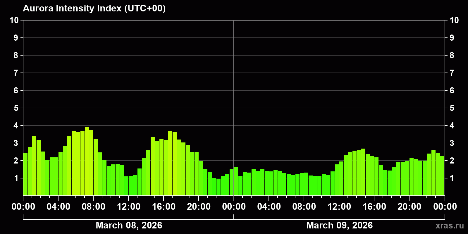 Auroral intensity index and the theoretically possible latitude of observations for nighttime in the Estern Hemisphere as of 2026-03-09 23:05 (end of day) local time