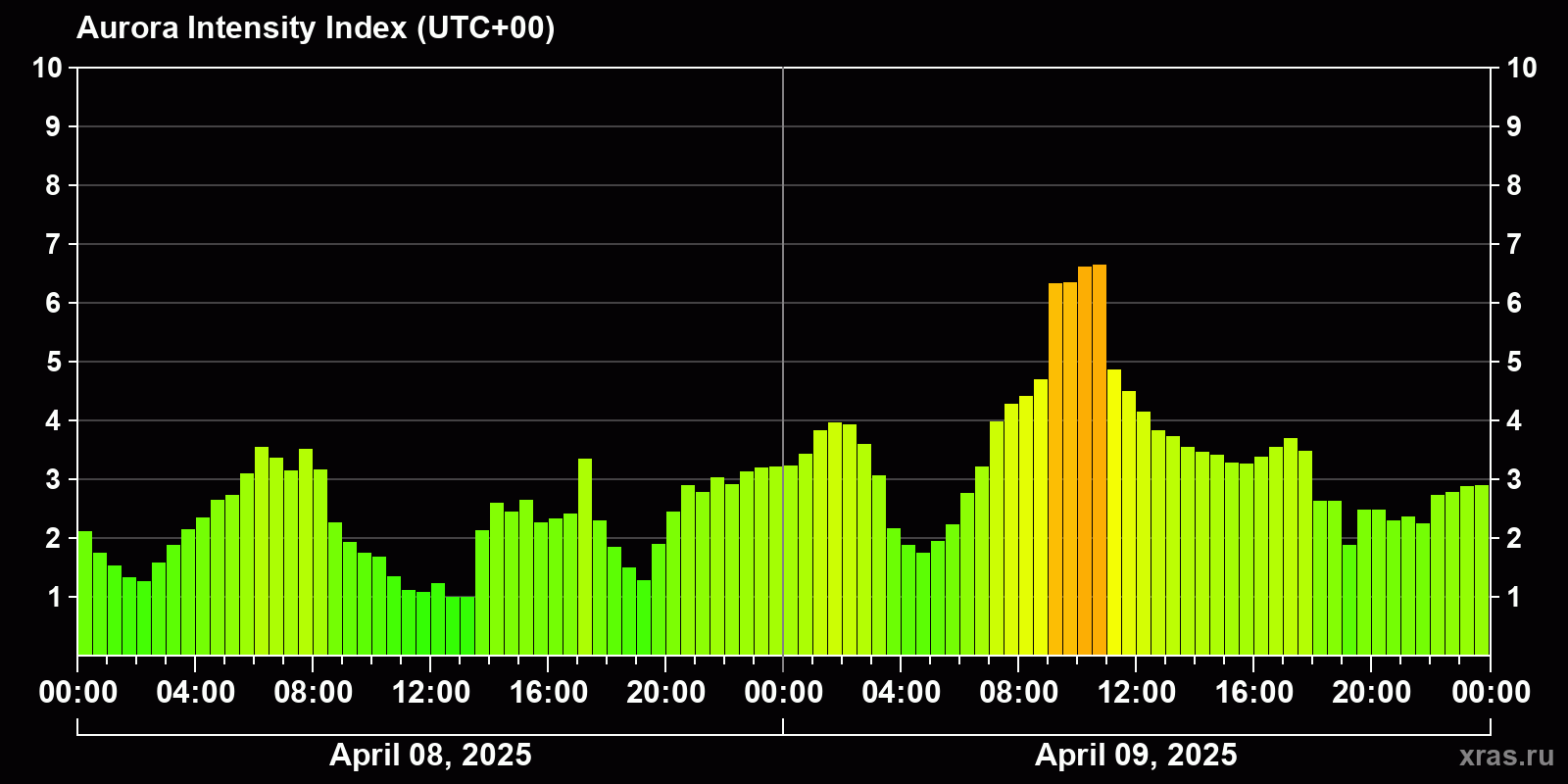 Auroral intensity index and the theoretically possible latitude of observations for nighttime in the Estern Hemisphere as of 2025-04-09 23:58 (end of day) local time