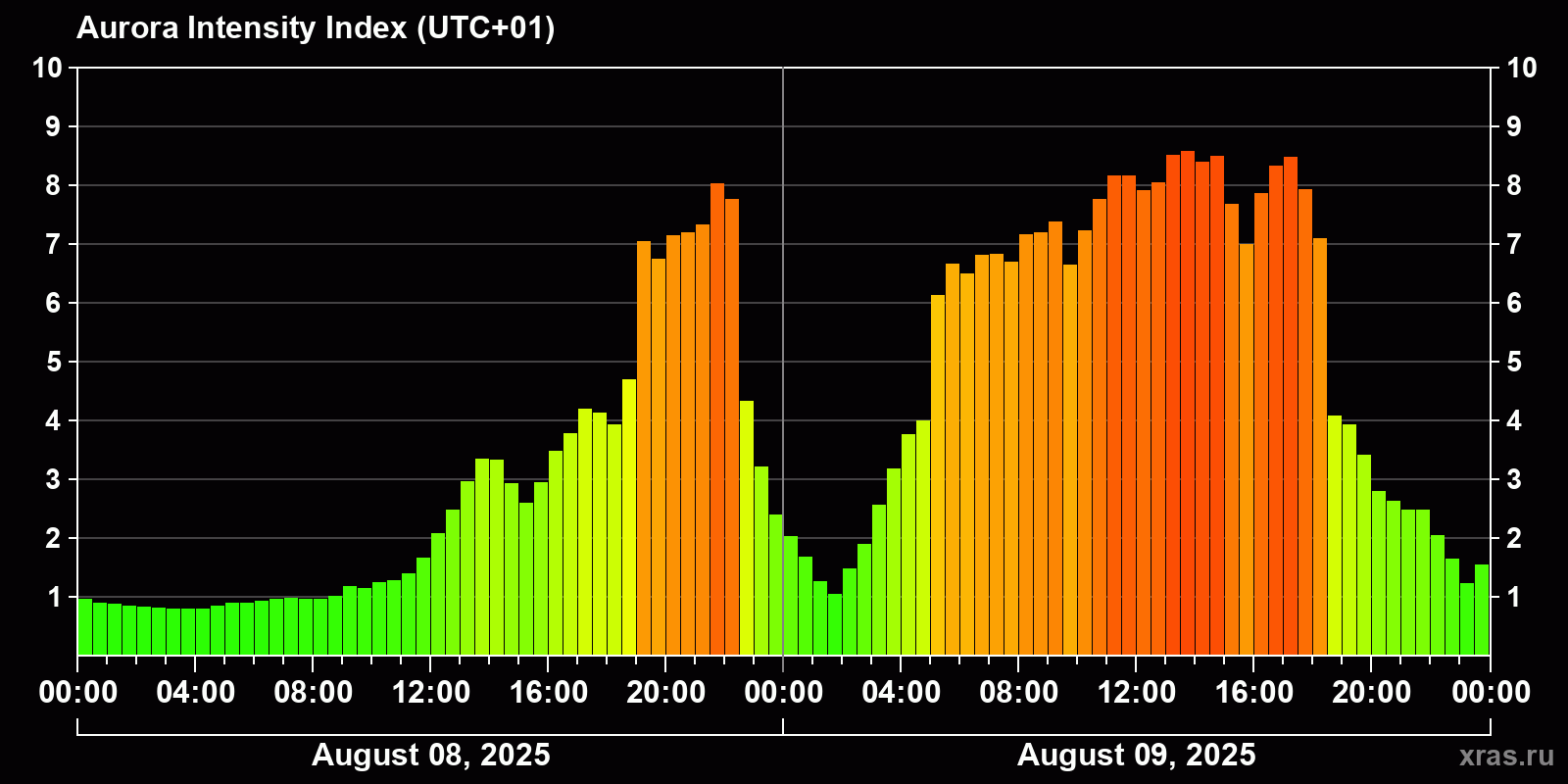 Changes in the auroral intensity index from 2025-08-08 to 2025-08-09 local time