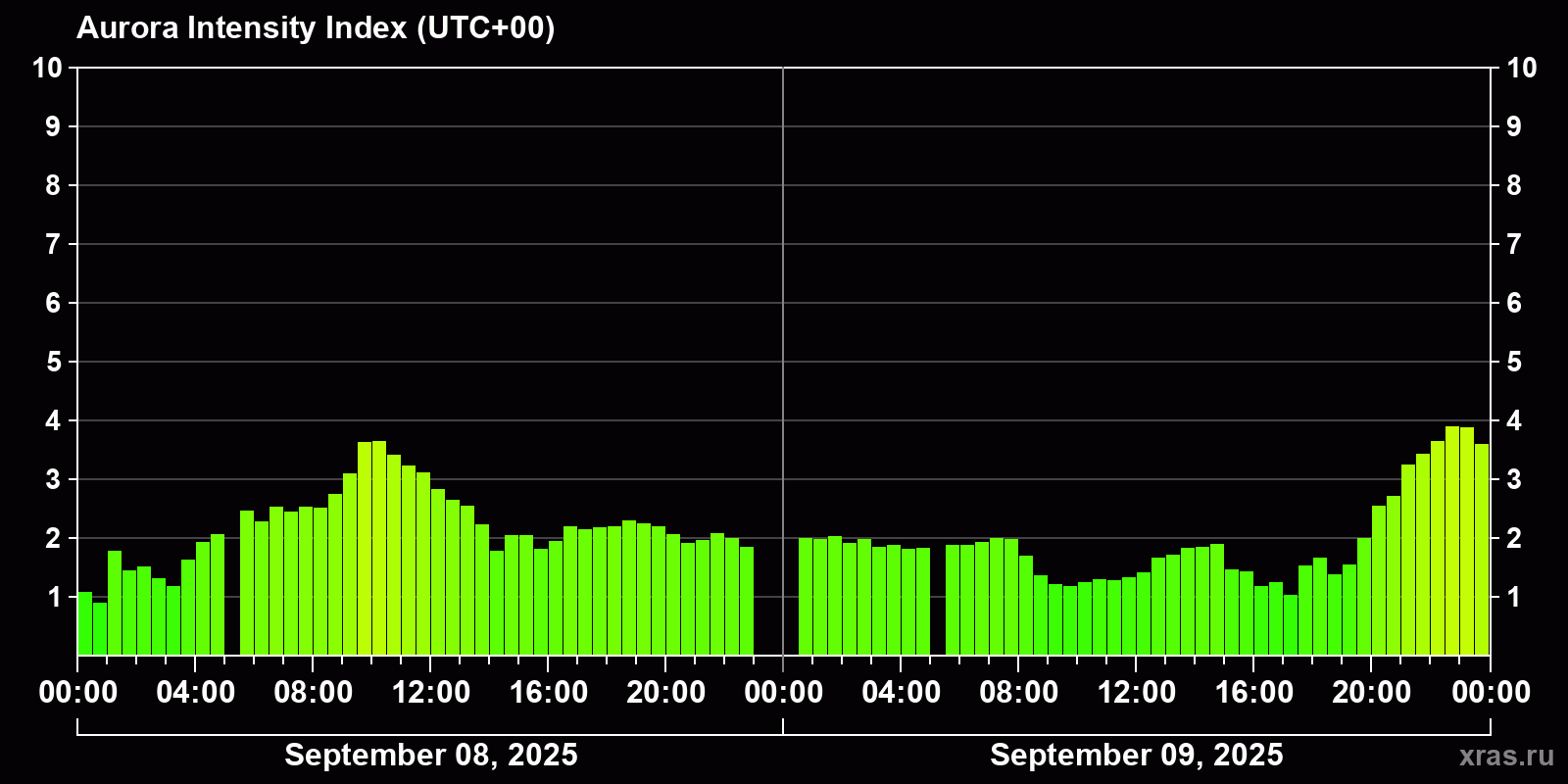 Auroral intensity index and the theoretically possible latitude of observations for nighttime in the Estern Hemisphere as of 2025-09-09 22:46 (end of day) local time