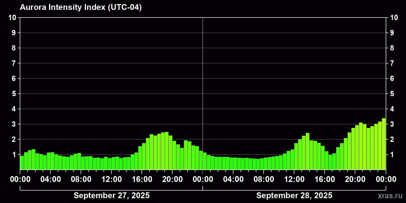 Changes in the auroral intensity index from 2025-09-27 to 2025-09-28 local time