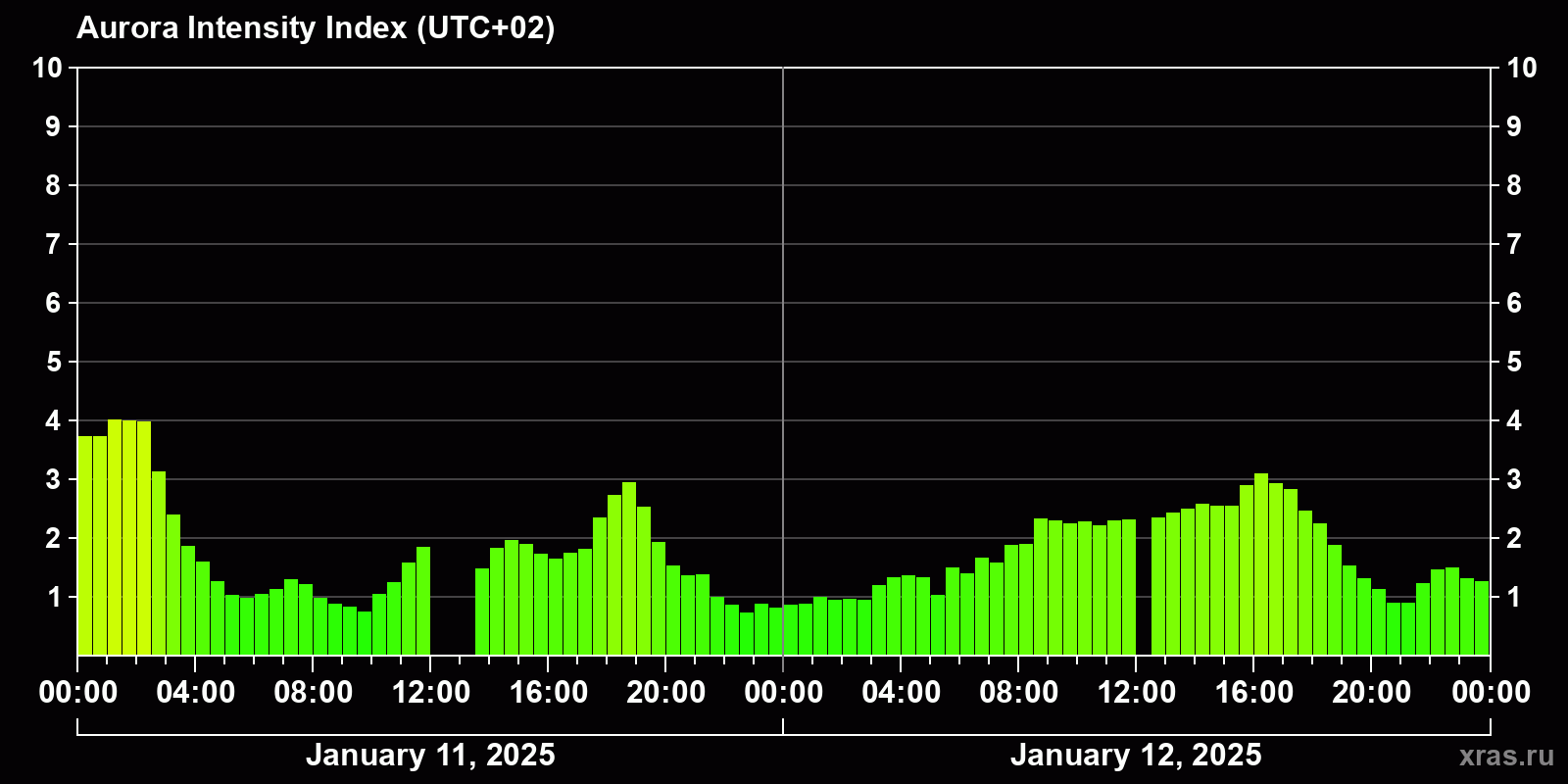 Changes in the auroral intensity index from 2025-01-11 to 2025-01-12 local time