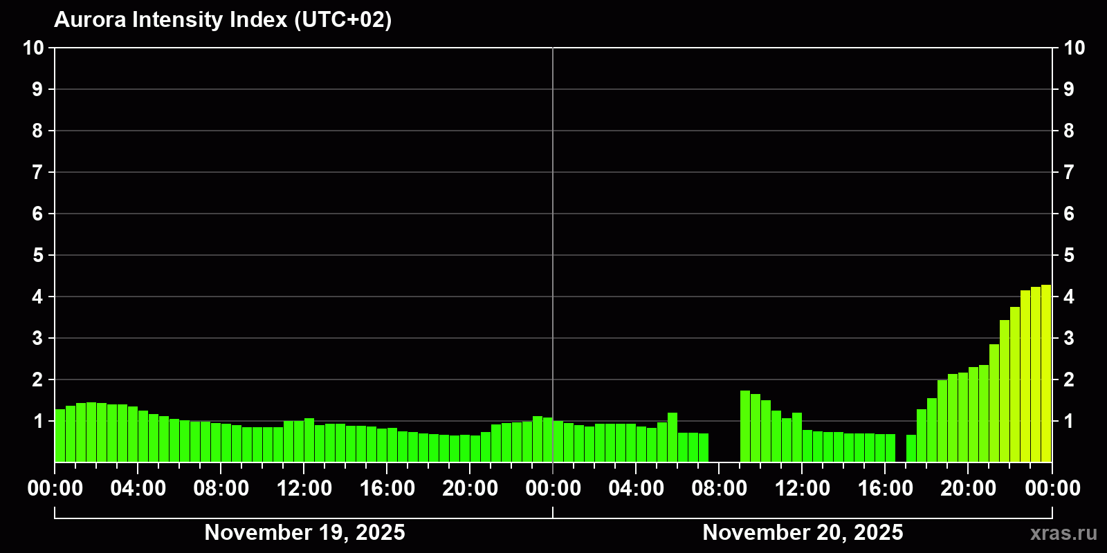 Auroral intensity index and the theoretically possible latitude of observations for nighttime in the Estern Hemisphere as of 2025-11-20 23:40 (end of day) local time