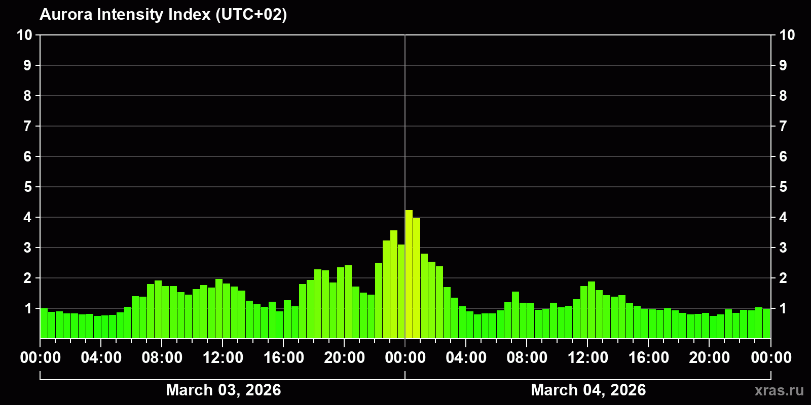 Changes in the auroral intensity index from 2026-03-03 to 2026-03-04 local time