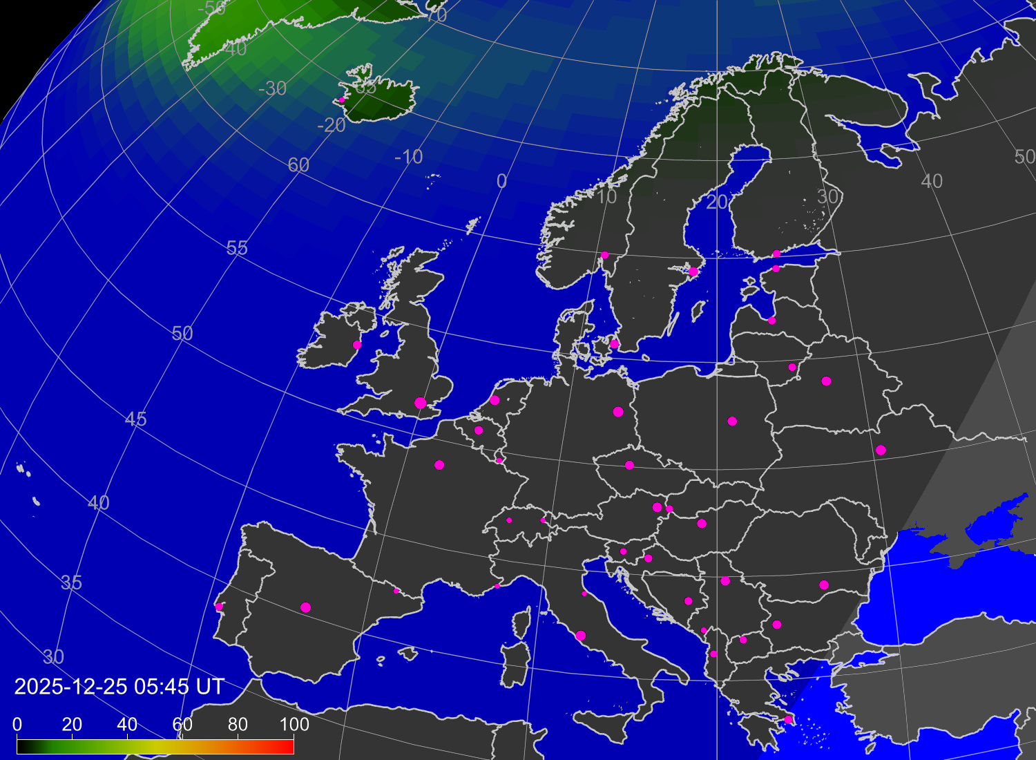 Индекс интенсивности полярных сияний и теоретически возможная широта наблюдений для ночного времени в восточном полушарии