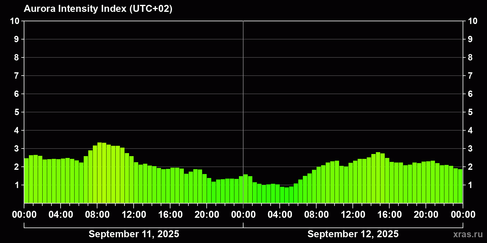 Auroral intensity index and the theoretically possible latitude of observations for nighttime in the Estern Hemisphere as of 2025-09-12 23:57 (end of day) local time