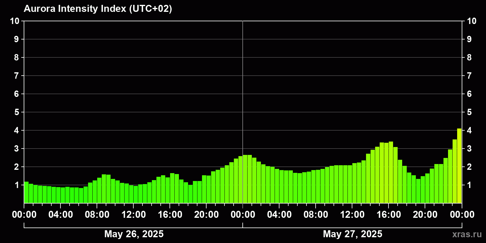 Changes in the auroral intensity index from 2025-05-26 to 2025-05-27 local time