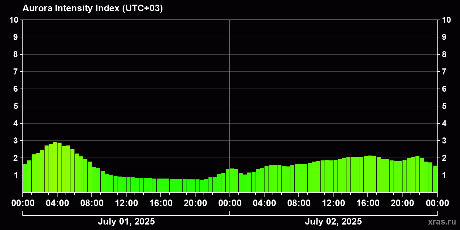 Changes in the auroral intensity index from 2025-07-01 to 2025-07-02 local time