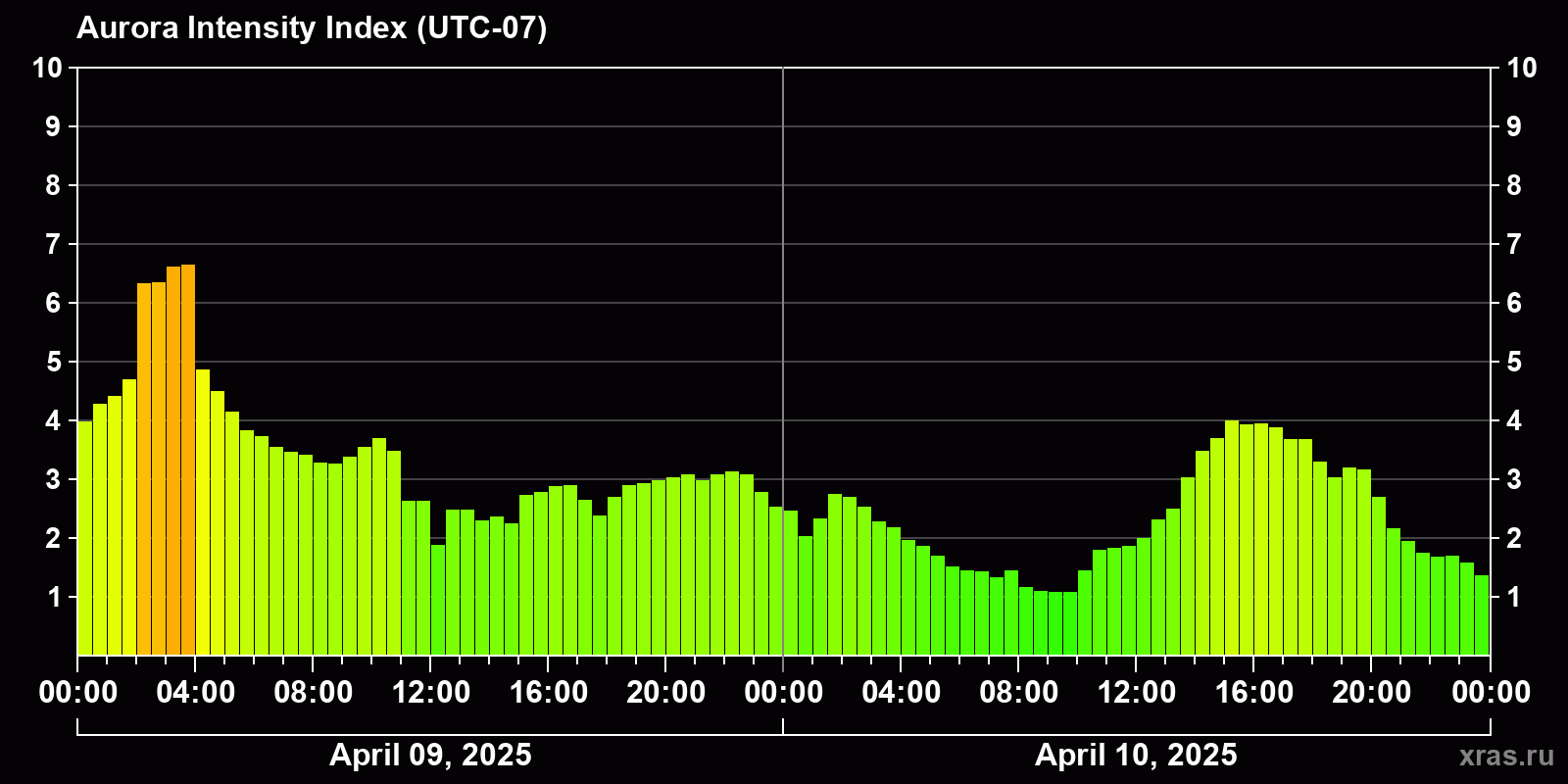 Changes in the auroral intensity index from 2025-04-09 to 2025-04-10 local time