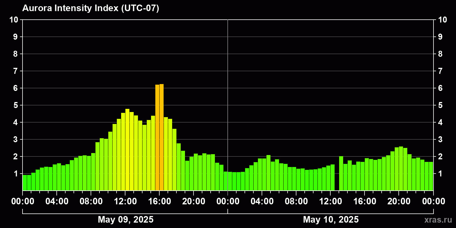 Auroral intensity index and the theoretically possible latitude of observations for nighttime in the Western Hemisphere as of 2025-05-10 23:59 (end of day) local time
