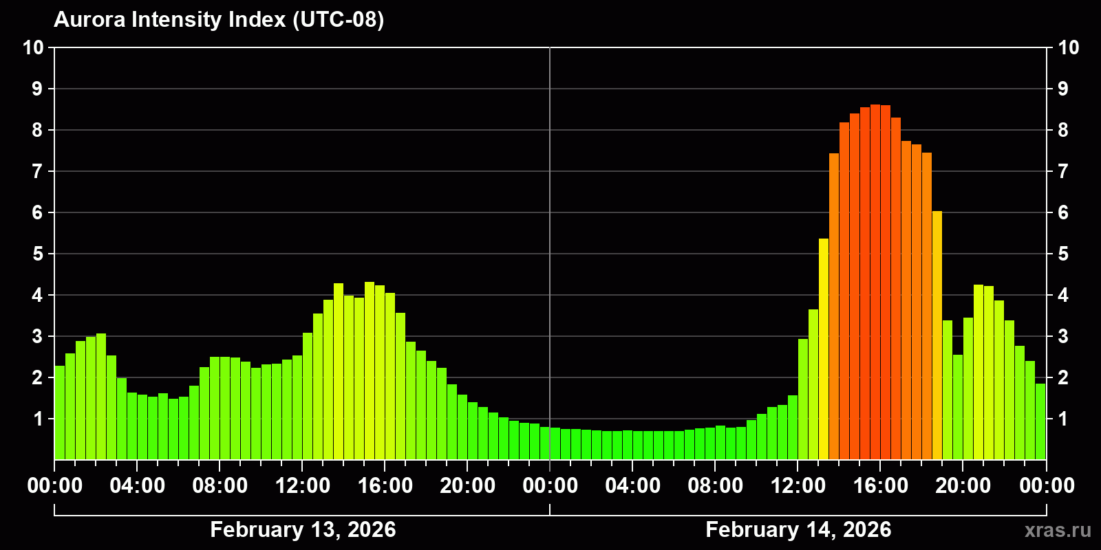 Changes in the auroral intensity index from 2026-02-13 to 2026-02-14 local time