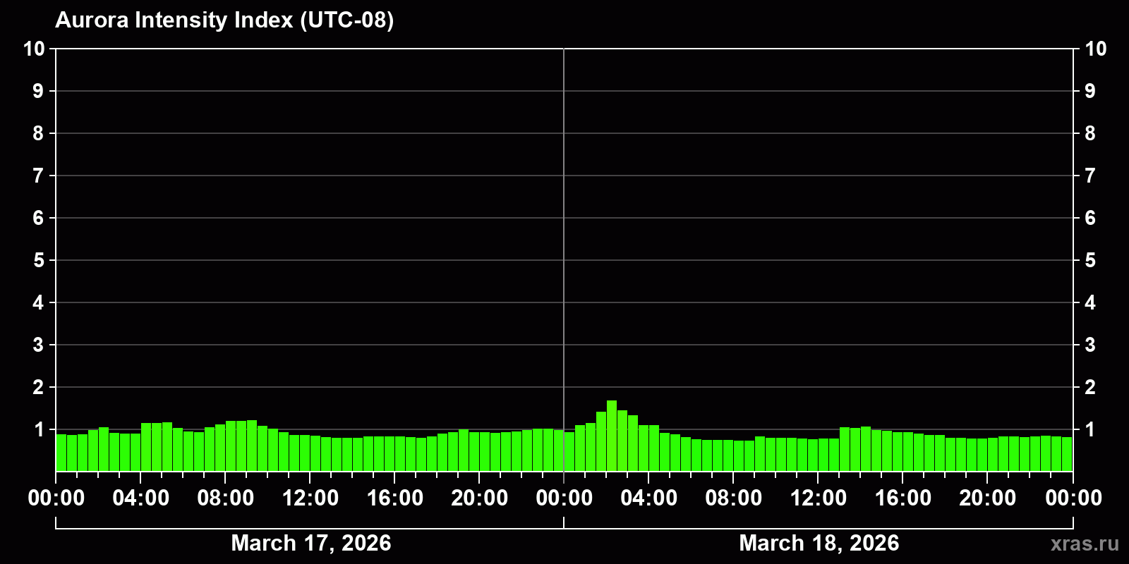 Changes in the auroral intensity index from 2026-03-17 to 2026-03-18 local time