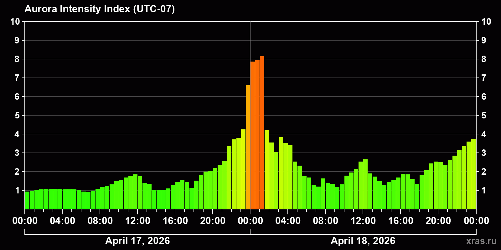 Changes in the auroral intensity index from 2026-04-17 to 2026-04-18 local time