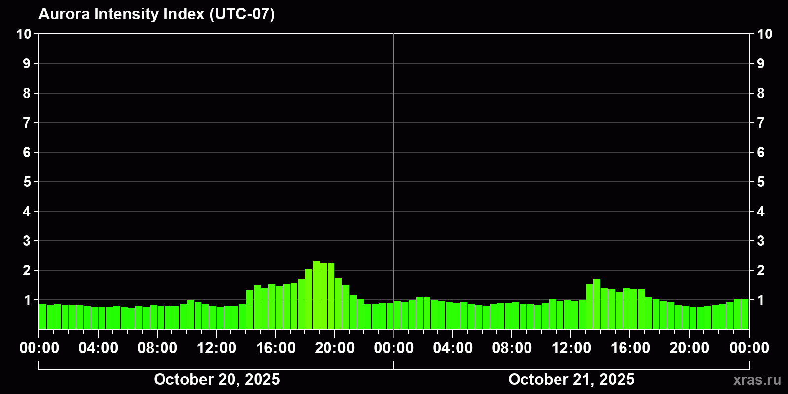 Auroral intensity index and the theoretically possible latitude of observations for nighttime in the Western Hemisphere as of 2025-10-21 23:53 (end of day) local time