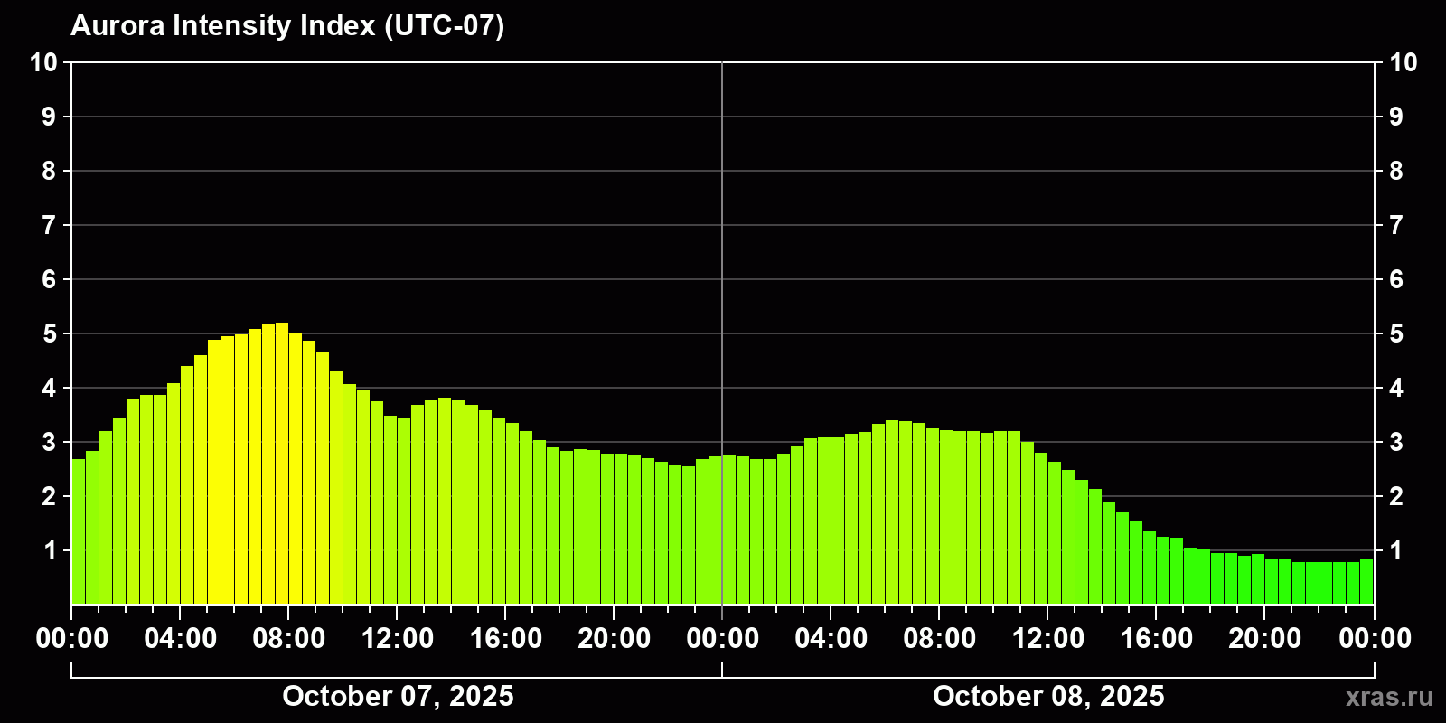Changes in the auroral intensity index from 2025-10-07 to 2025-10-08 local time