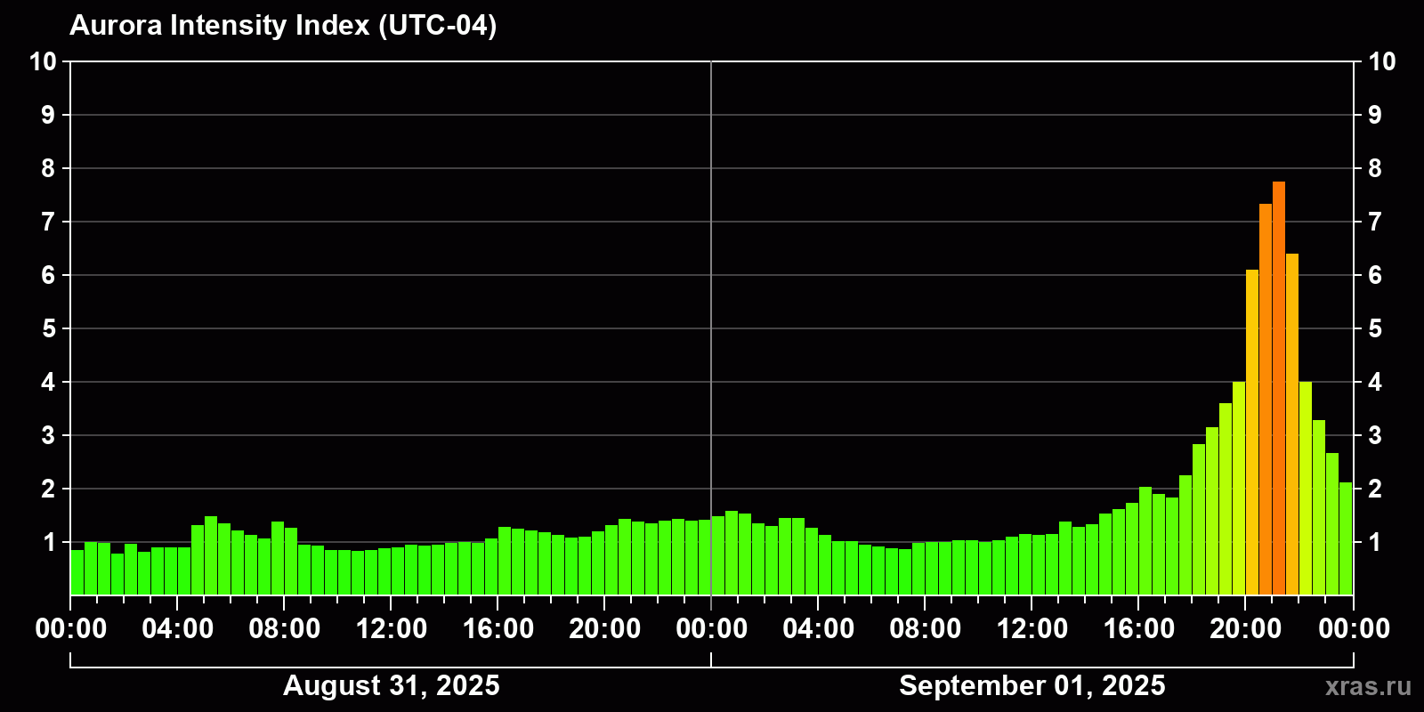 Changes in the auroral intensity index from 2025-08-31 to 2025-09-01 local time