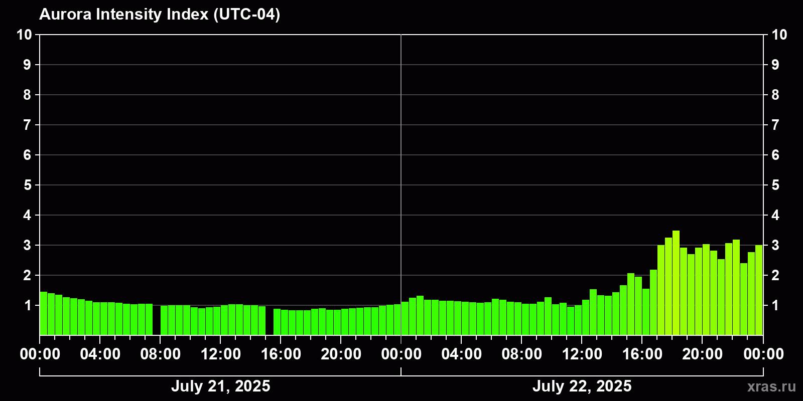 Auroral intensity index and the theoretically possible latitude of observations for nighttime in the Western Hemisphere as of 2025-07-22 23:50 (end of day) local time
