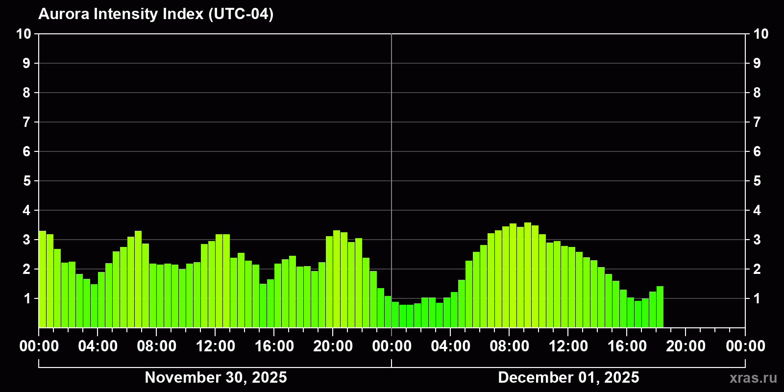 Auroral intensity index and the theoretically possible latitude of observations for nighttime in the Western Hemisphere as of 2025-12-01 10:20 (end of day) local time
