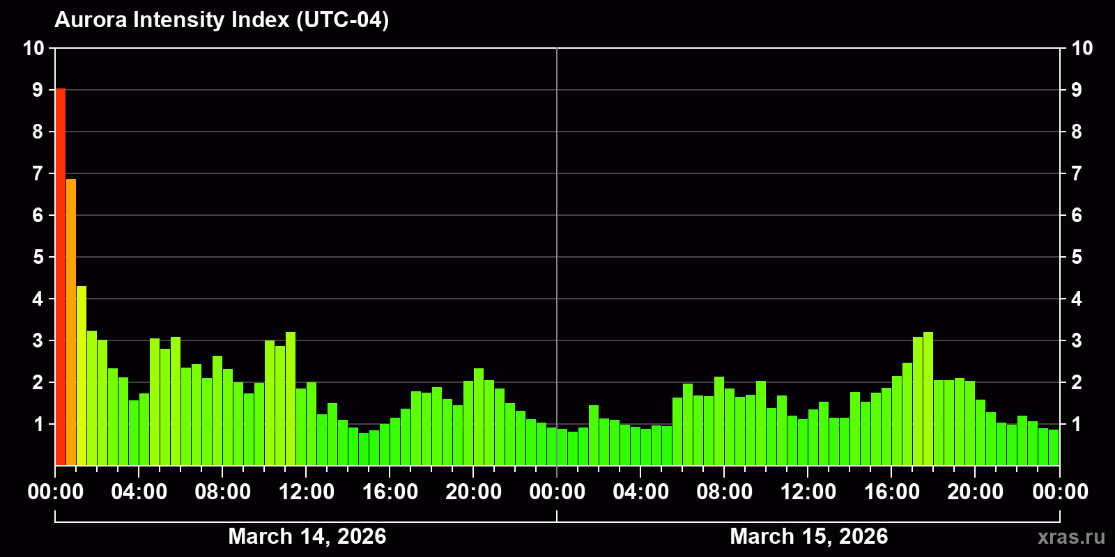 Auroral intensity index and the theoretically possible latitude of observations for nighttime in the Western Hemisphere as of 2026-03-15 23:46 (end of day) local time