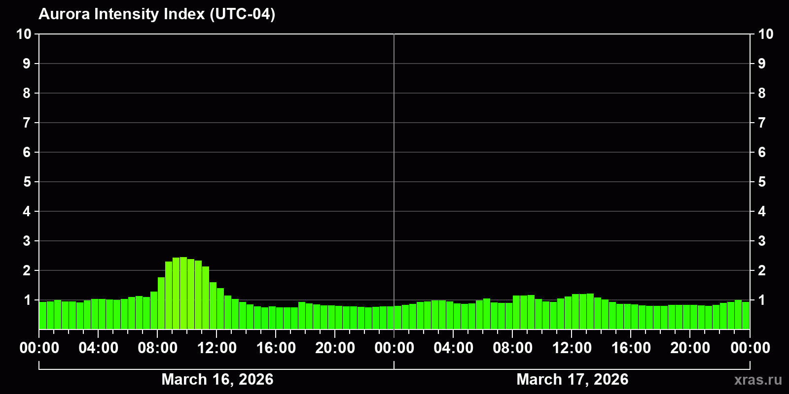 Auroral intensity index and the theoretically possible latitude of observations for nighttime in the Western Hemisphere as of 2026-03-17 23:45 (end of day) local time