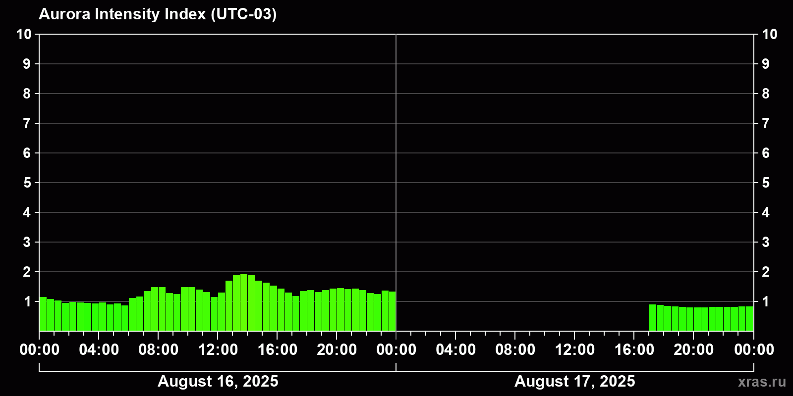 Changes in the auroral intensity index from 2025-08-16 to 2025-08-17 local time