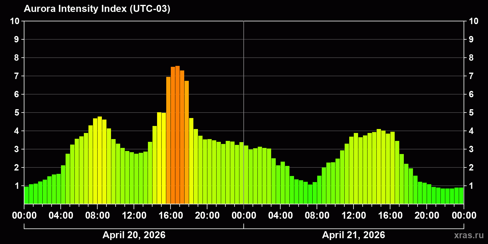 Changes in the auroral intensity index from 2026-04-20 to 2026-04-21 local time