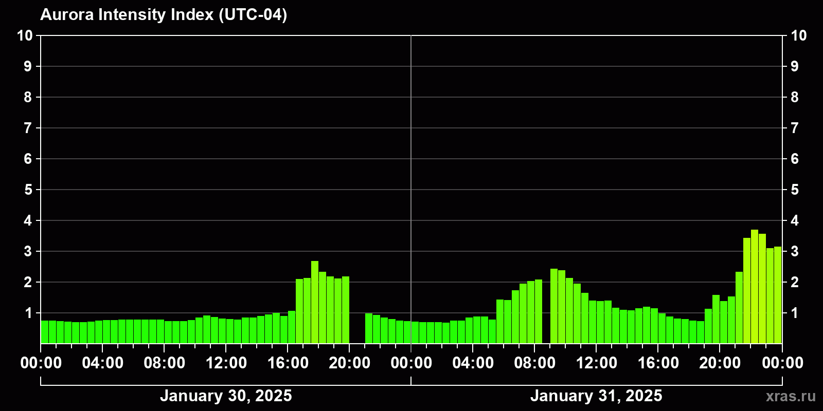 Changes in the auroral intensity index from 2025-01-30 to 2025-01-31 local time