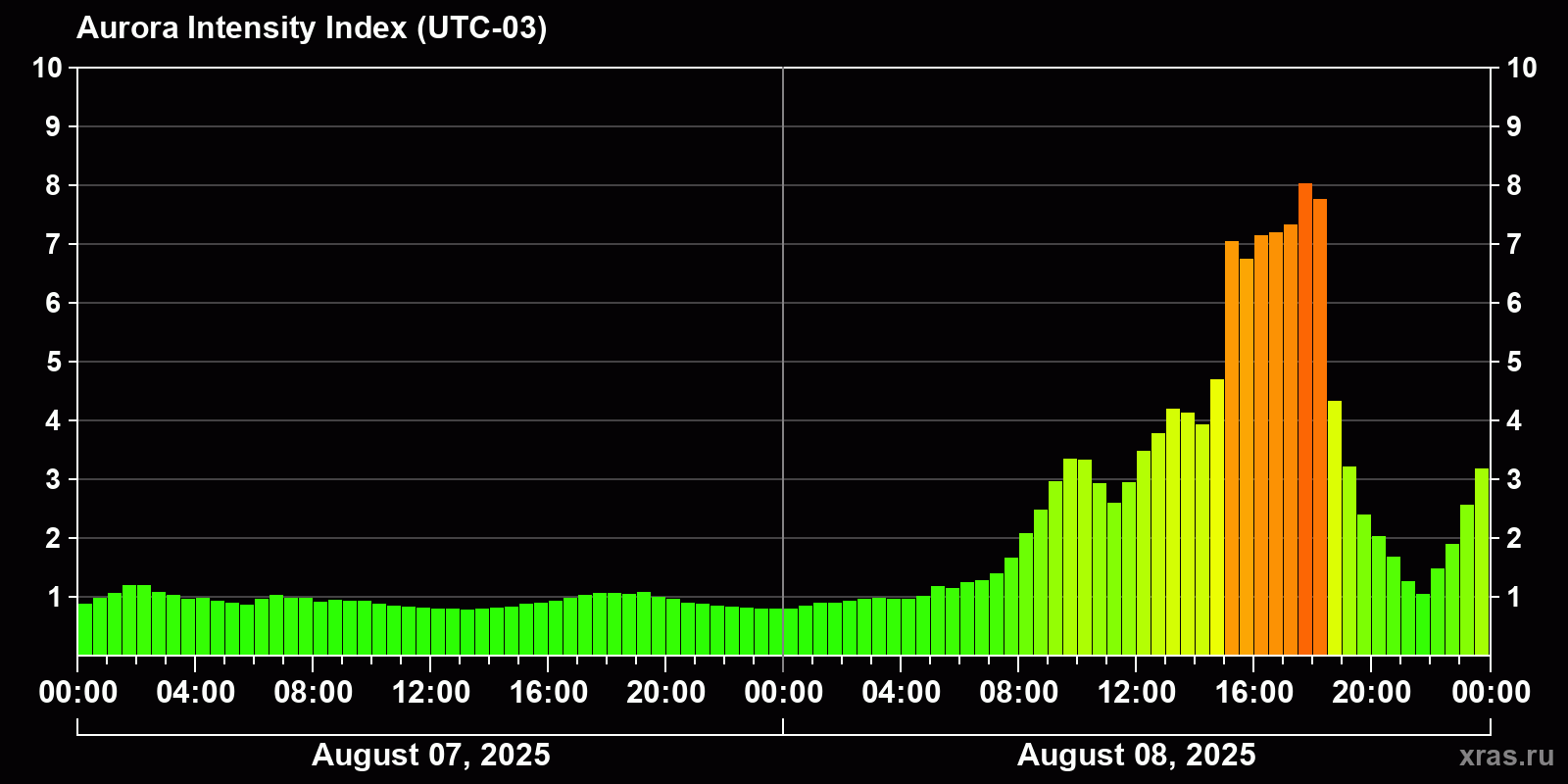 Changes in the auroral intensity index from 2025-08-07 to 2025-08-08 local time