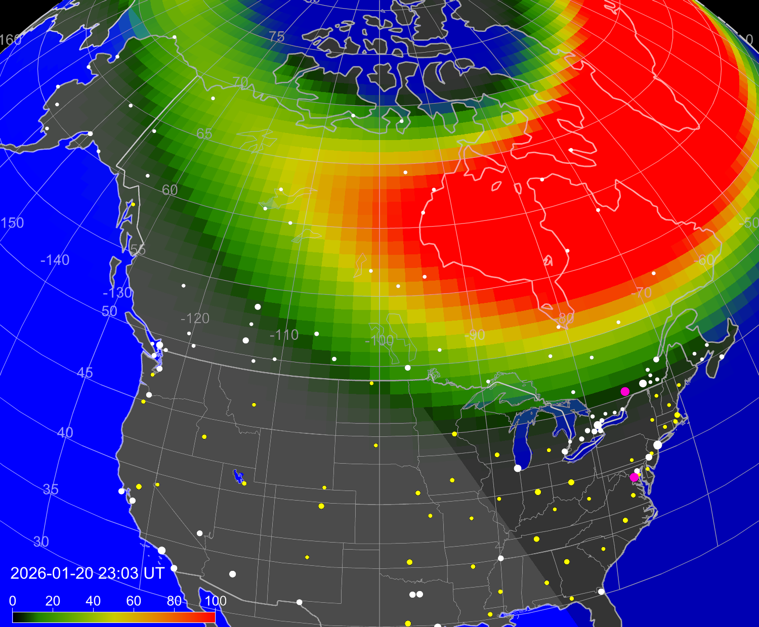 Вероятность полярных сияний в городах Канады