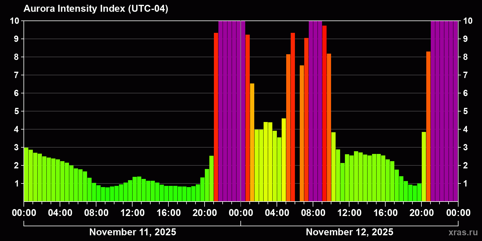 Changes in the auroral intensity index from 2025-11-11 to 2025-11-12 local time
