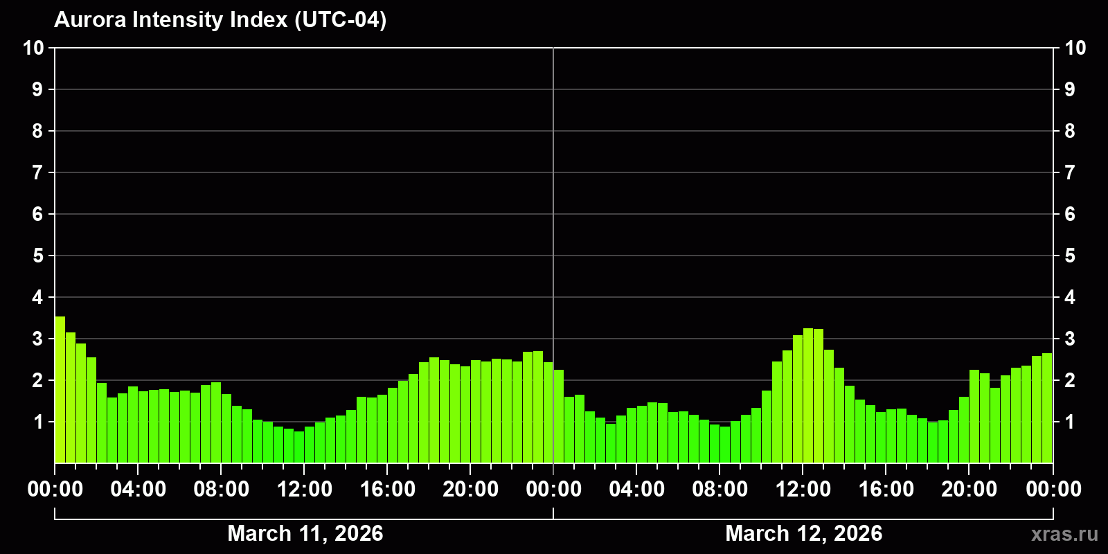 Changes in the auroral intensity index from 2026-03-11 to 2026-03-12 local time