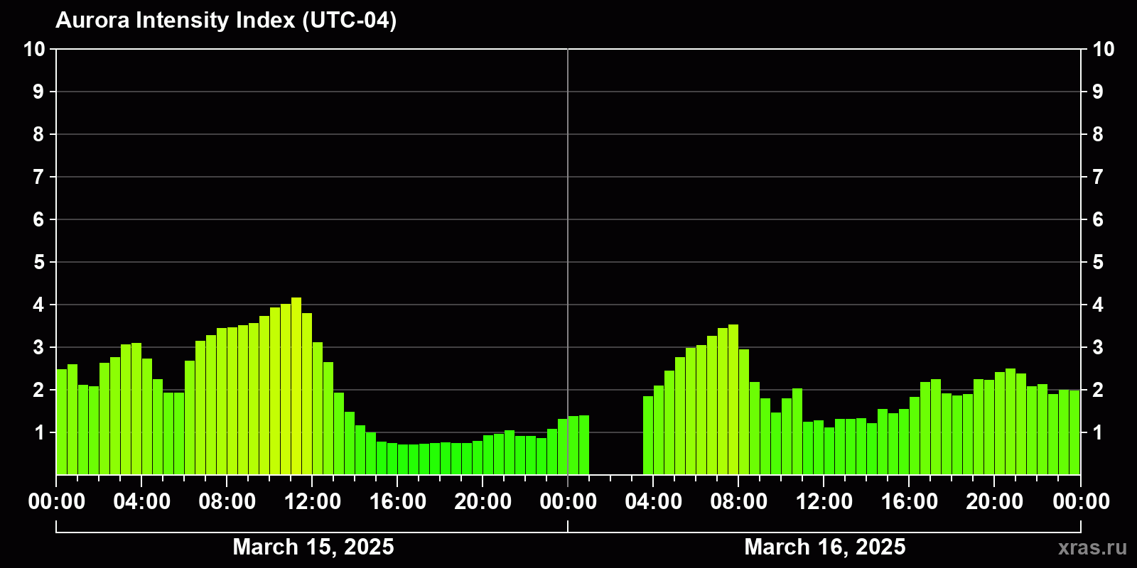 Auroral intensity index and the theoretically possible latitude of observations for nighttime in the Western Hemisphere as of 2025-03-16 23:51 (end of day) local time