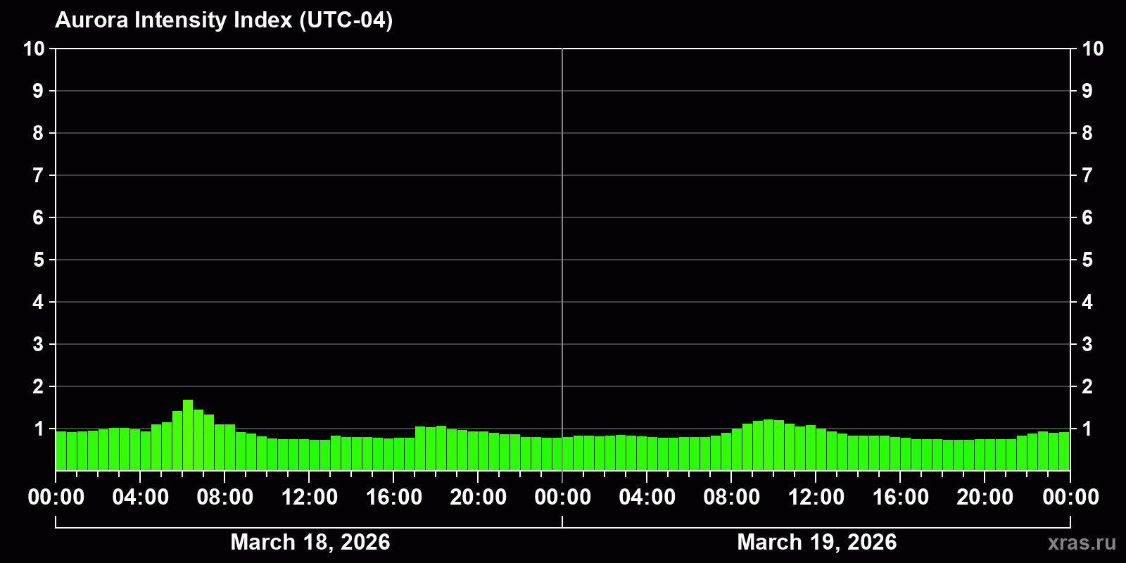 Auroral intensity index and the theoretically possible latitude of observations for nighttime in the Western Hemisphere as of 2026-03-19 23:46 (end of day) local time