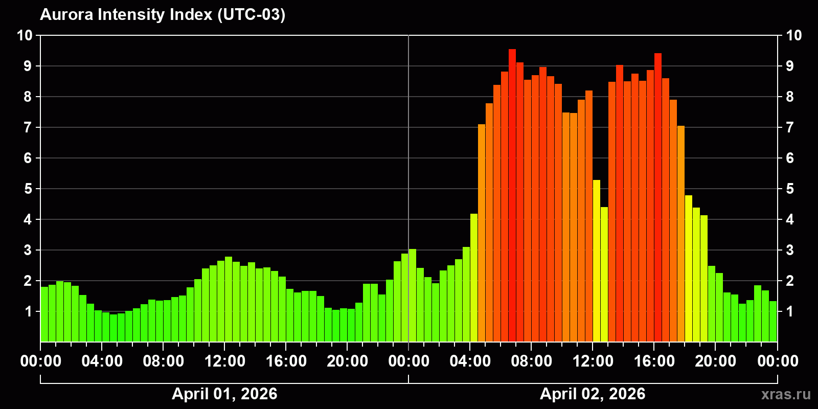 Changes in the auroral intensity index from 2026-04-01 to 2026-04-02 local time