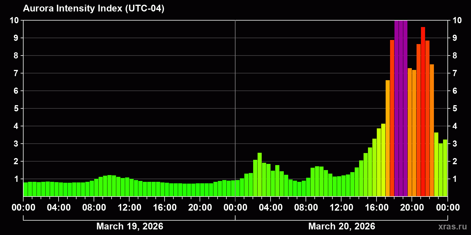 Changes in the auroral intensity index from 2026-03-19 to 2026-03-20 local time