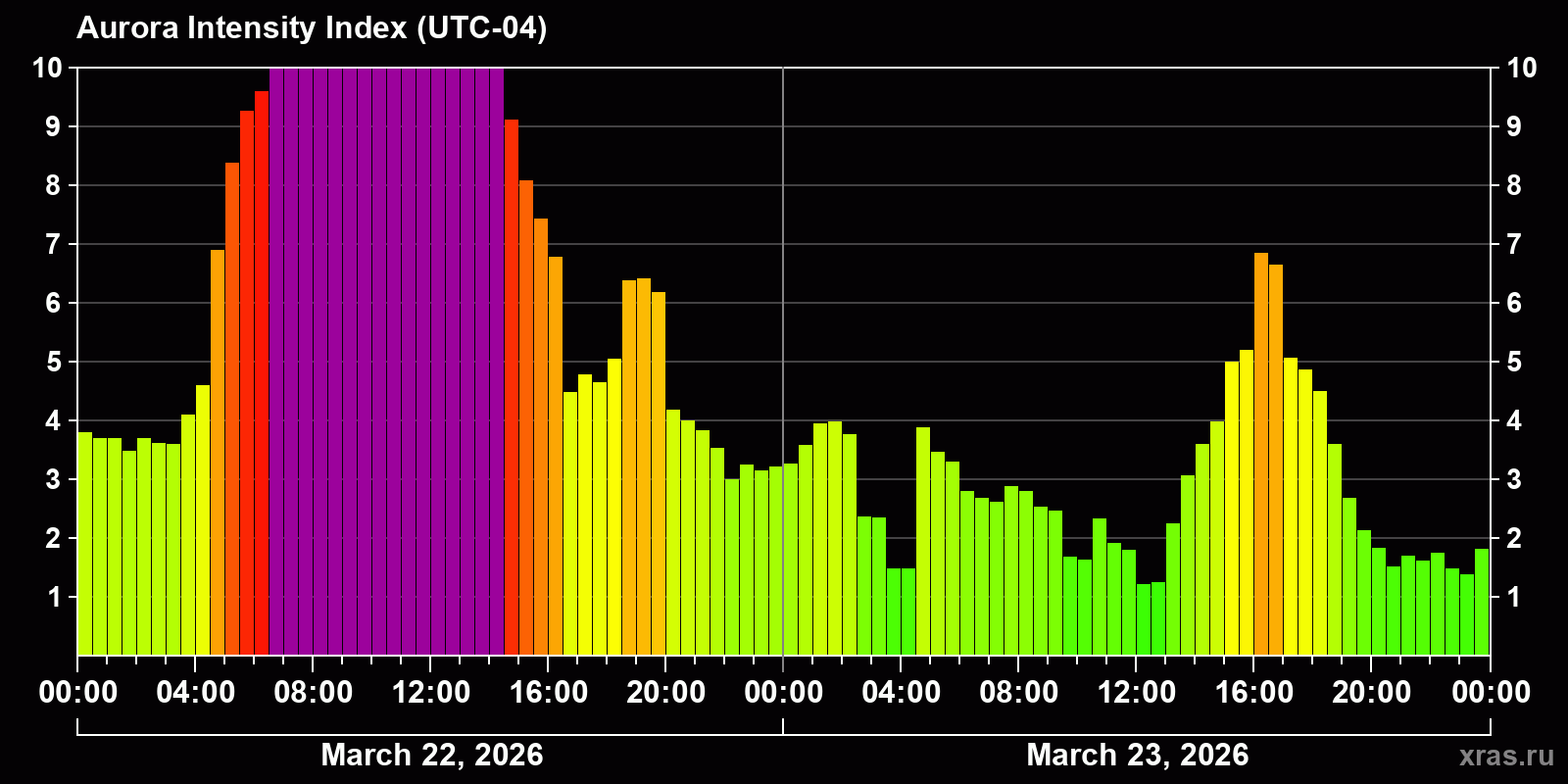 Auroral intensity index and the theoretically possible latitude of observations for nighttime in the Western Hemisphere as of 2026-03-23 23:50 (end of day) local time