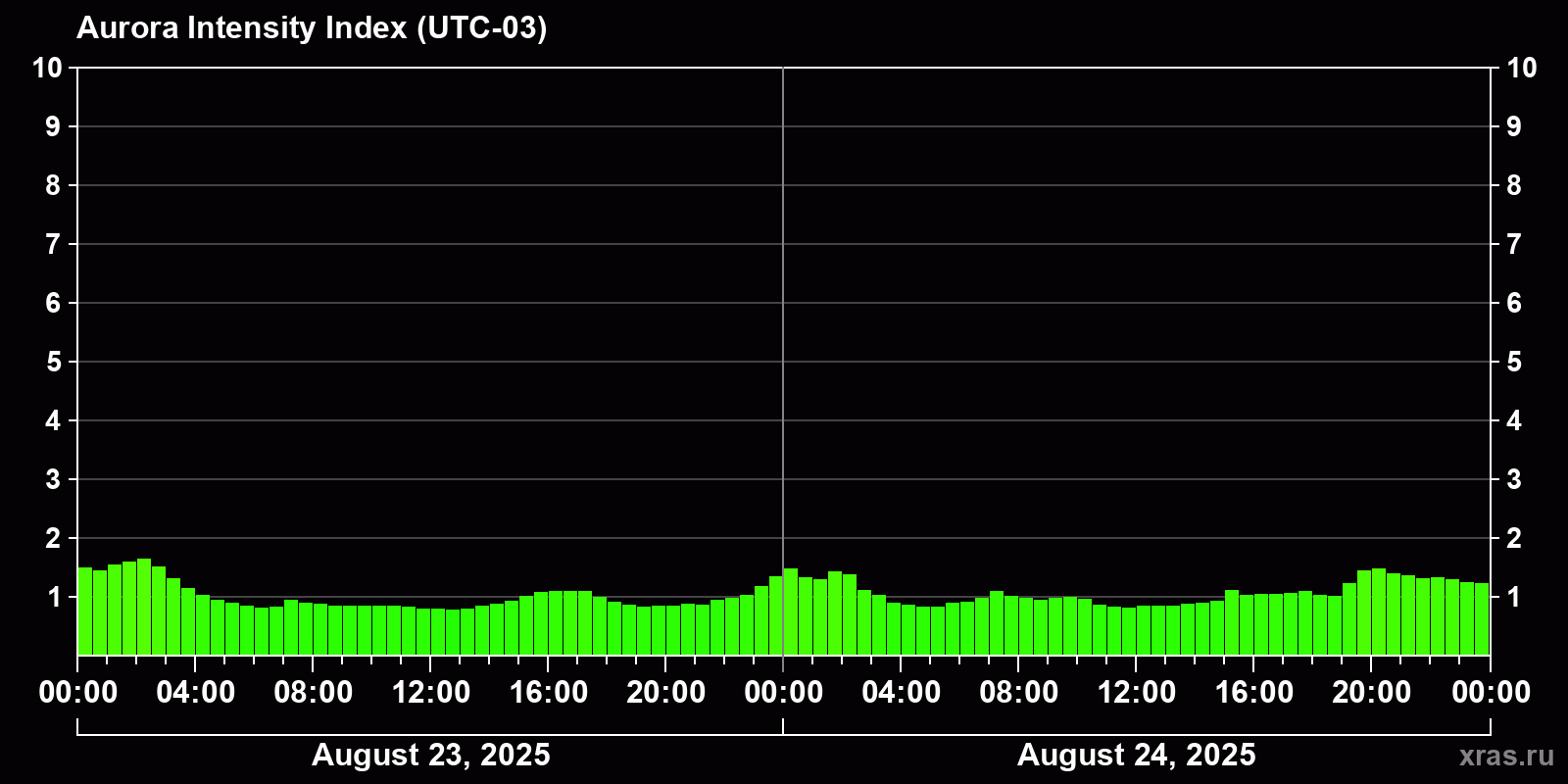Auroral intensity index and the theoretically possible latitude of observations for nighttime in the Western Hemisphere as of 2025-08-24 23:48 (end of day) local time