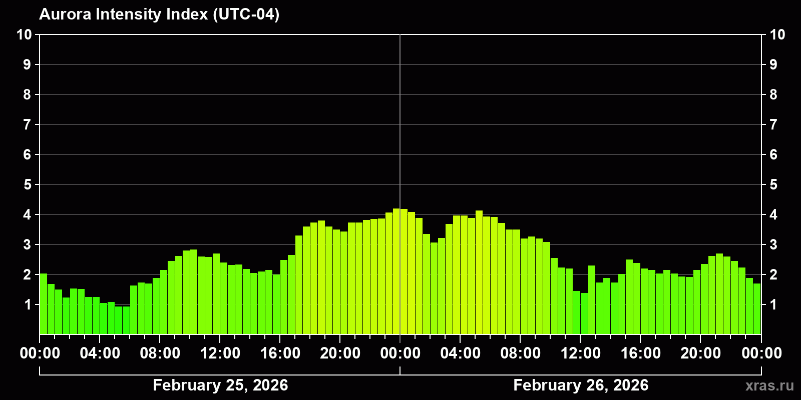 Auroral intensity index and the theoretically possible latitude of observations for nighttime in the Western Hemisphere as of 2026-02-26 23:56 (end of day) local time