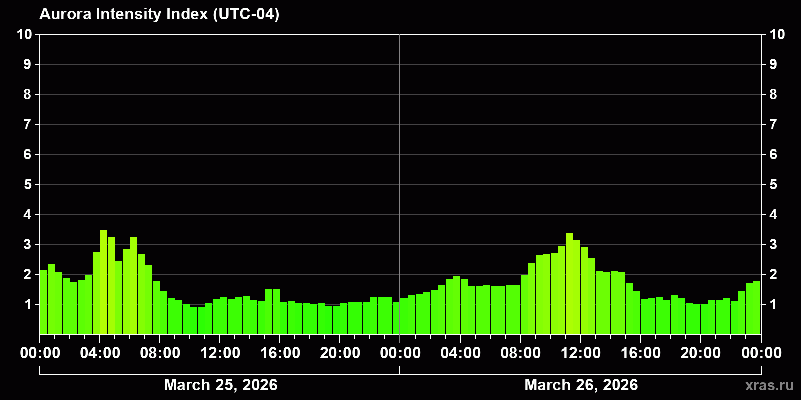 Auroral intensity index and the theoretically possible latitude of observations for nighttime in the Western Hemisphere as of 2026-03-26 23:58 (end of day) local time