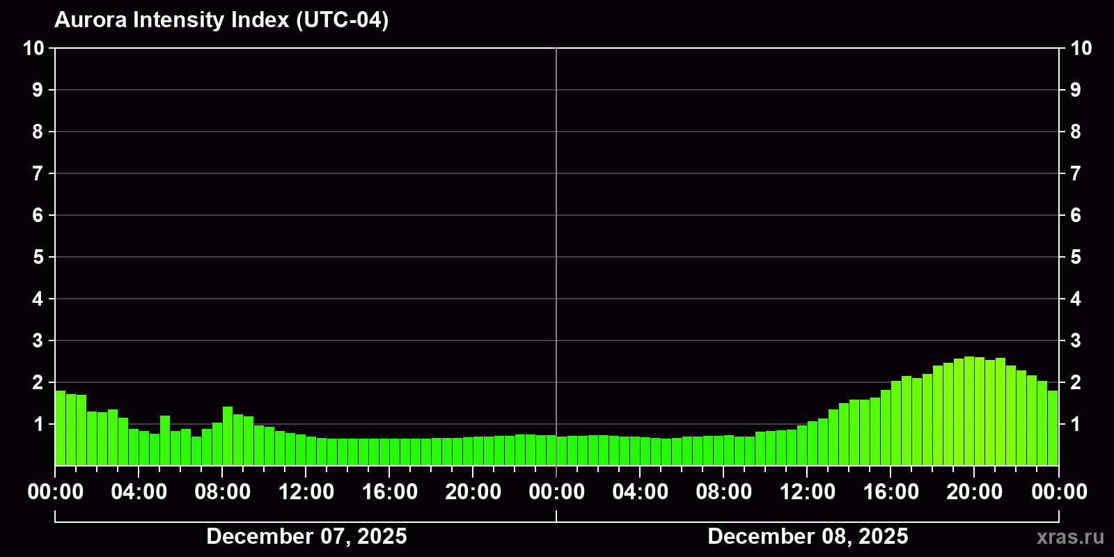 Changes in the auroral intensity index from 2025-12-07 to 2025-12-08 local time