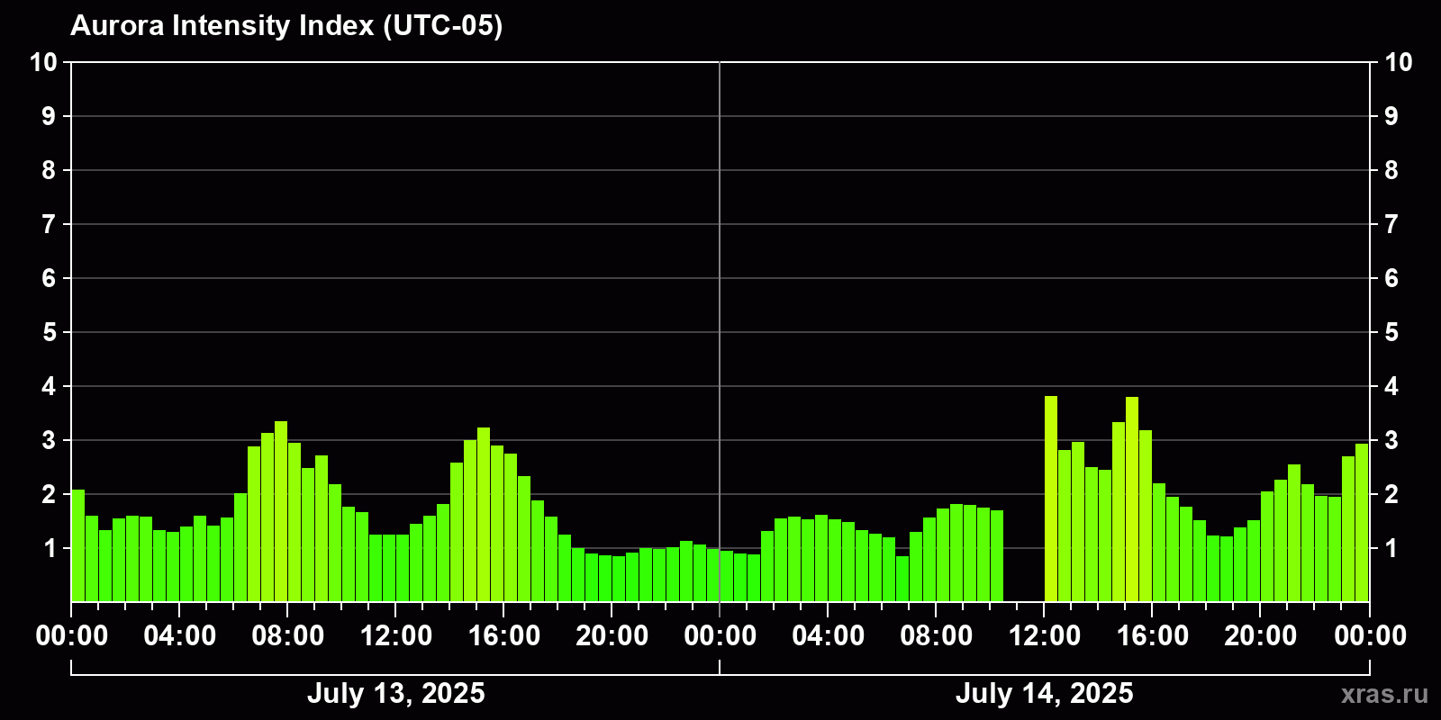 Auroral intensity index and the theoretically possible latitude of observations for nighttime in the Western Hemisphere as of 2025-07-14 23:49 (end of day) local time
