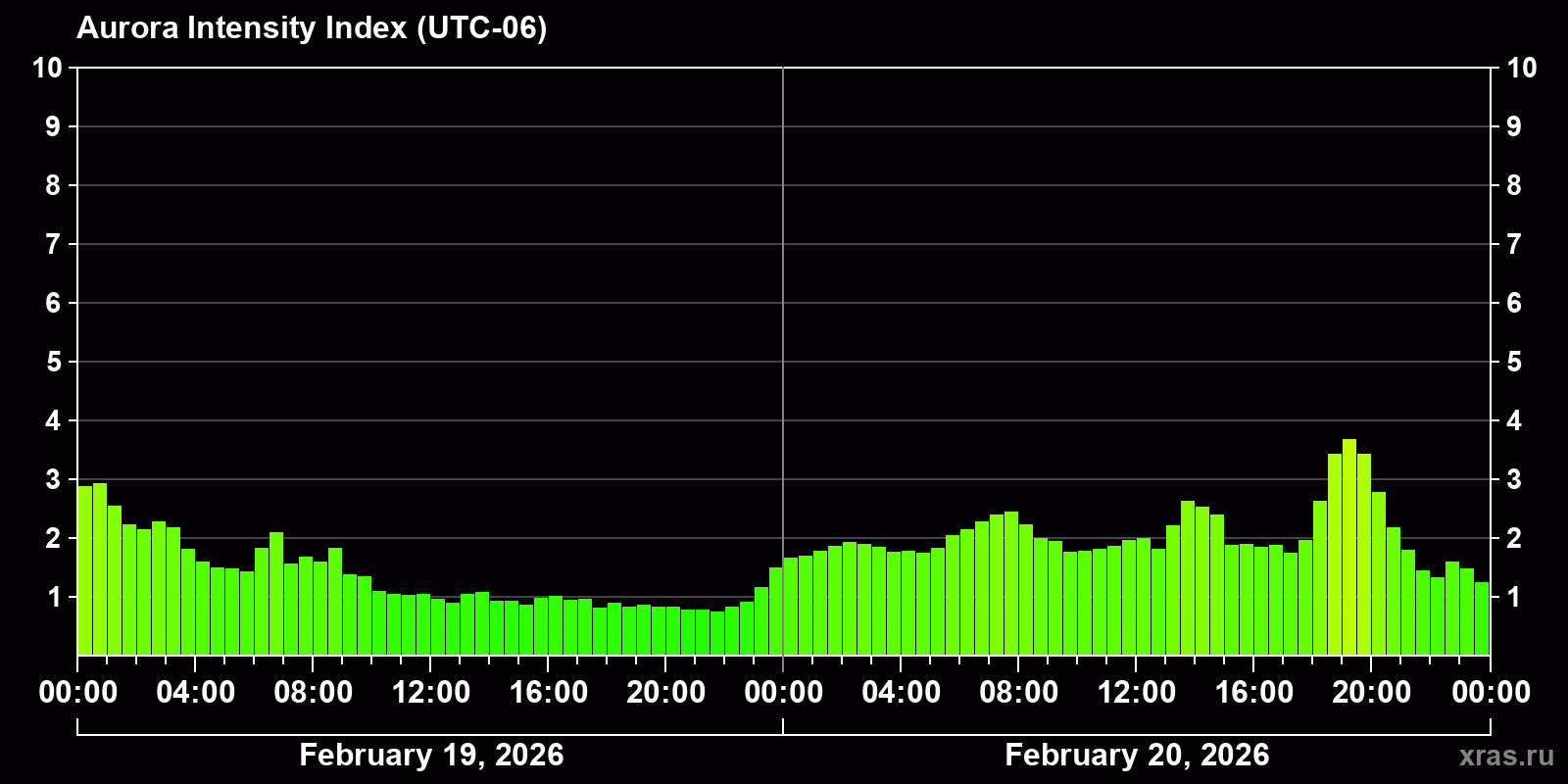 Auroral intensity index and the theoretically possible latitude of observations for nighttime in the Western Hemisphere as of 2026-02-20 23:55 (end of day) local time