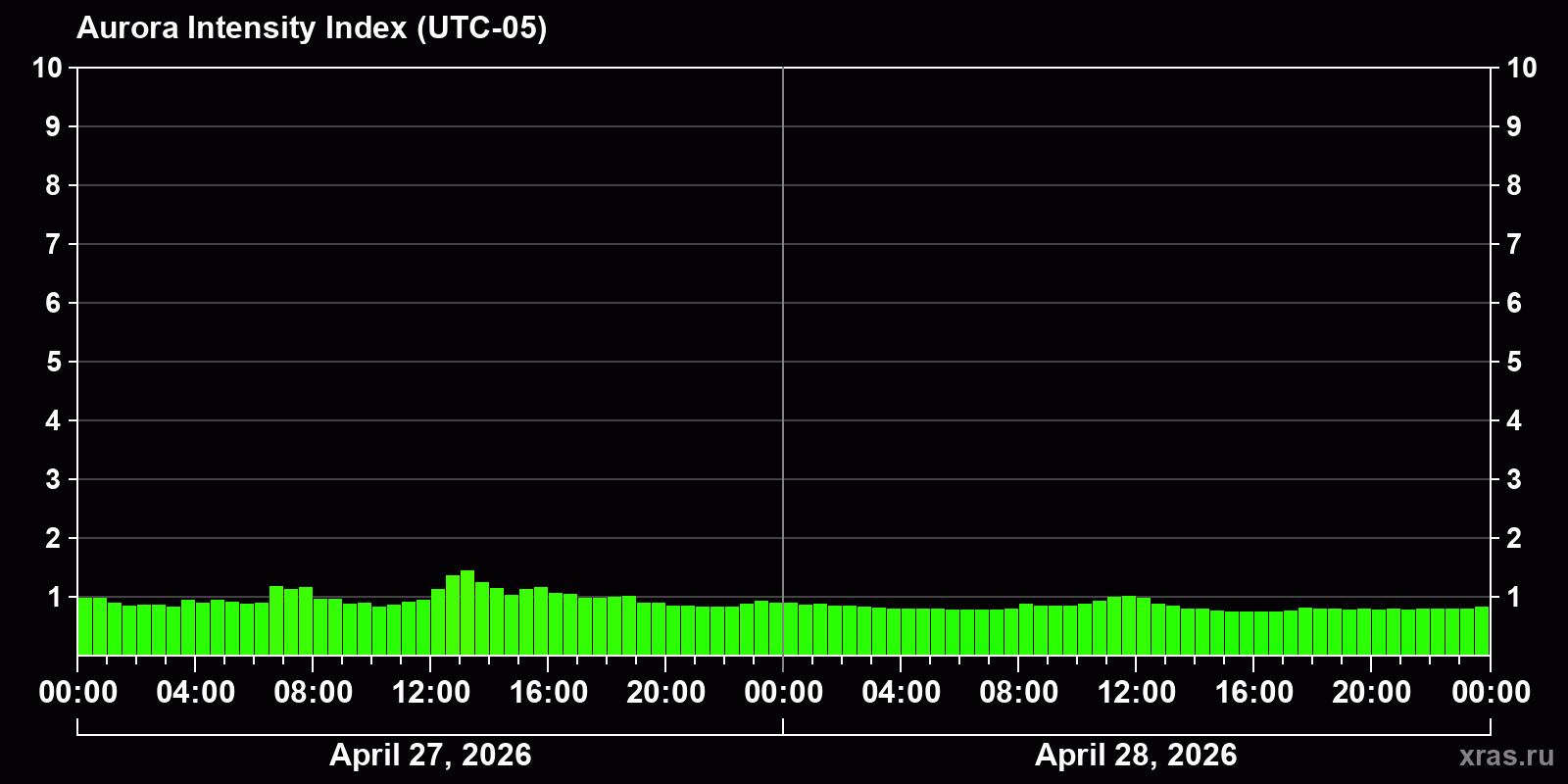 Changes in the auroral intensity index from 2026-04-27 to 2026-04-28 local time