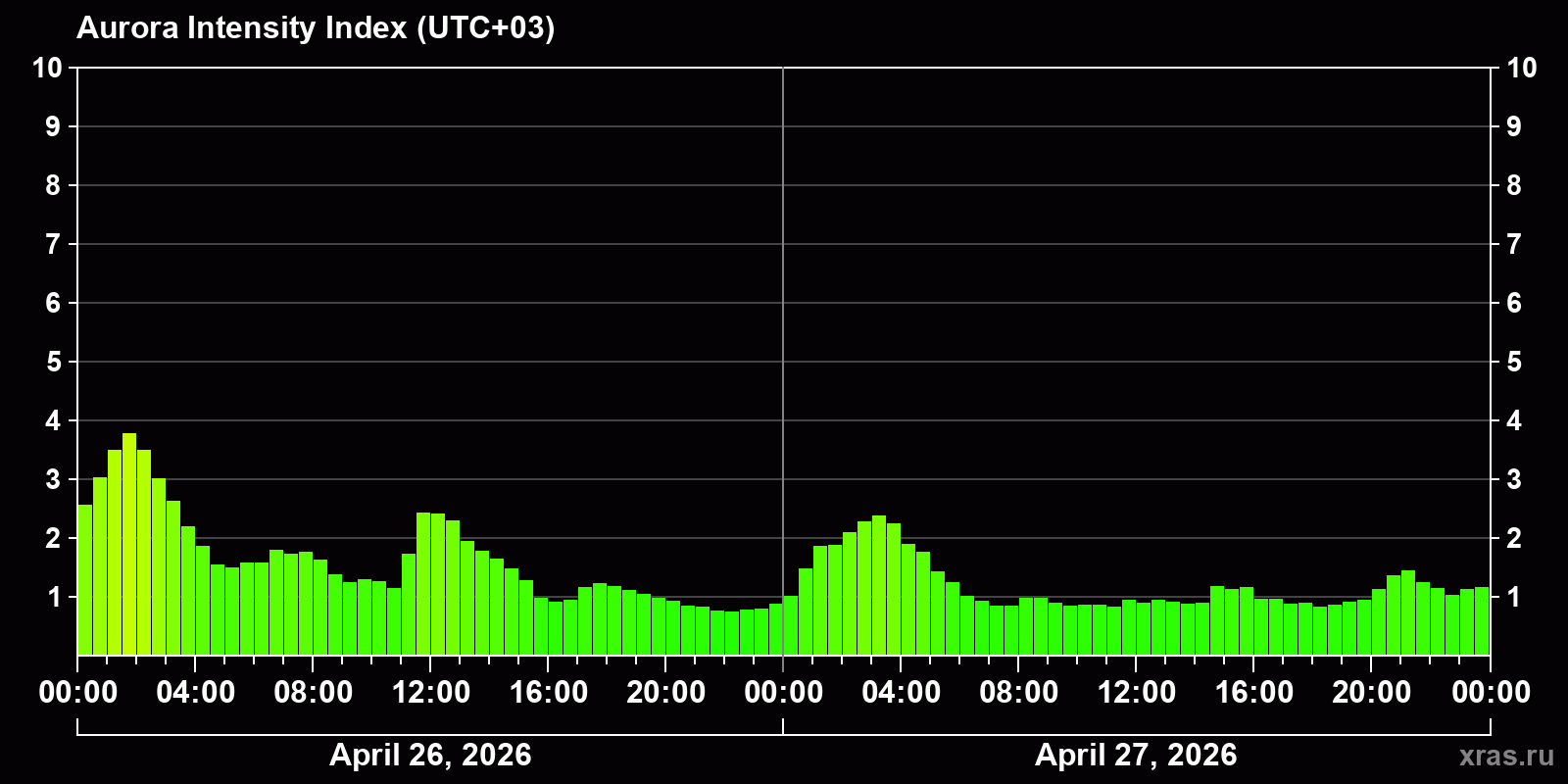 Auroral intensity index and the theoretically possible latitude of observations for nighttime in the Estern Hemisphere as of 2026-04-27 23:45 (end of day) local time