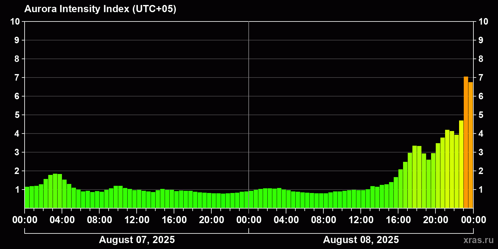 Changes in the auroral intensity index from 2025-08-07 to 2025-08-08 local time