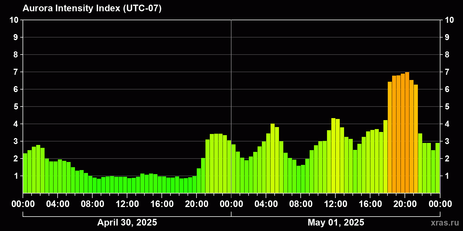 Changes in the auroral intensity index from 2025-04-30 to 2025-05-01 local time