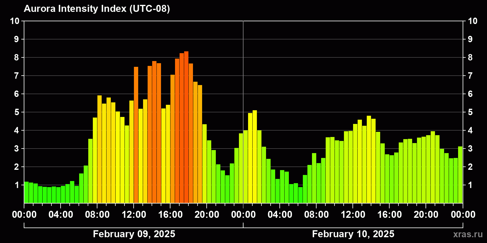 Changes in the auroral intensity index from 2025-02-09 to 2025-02-10 local time