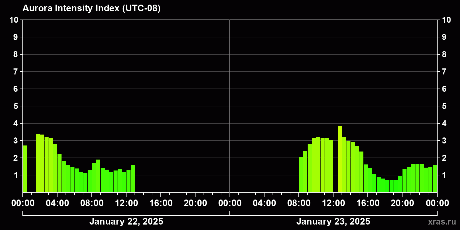 Auroral intensity index and the theoretically possible latitude of observations for nighttime in the Western Hemisphere as of 2025-01-23 23:54 (end of day) local time